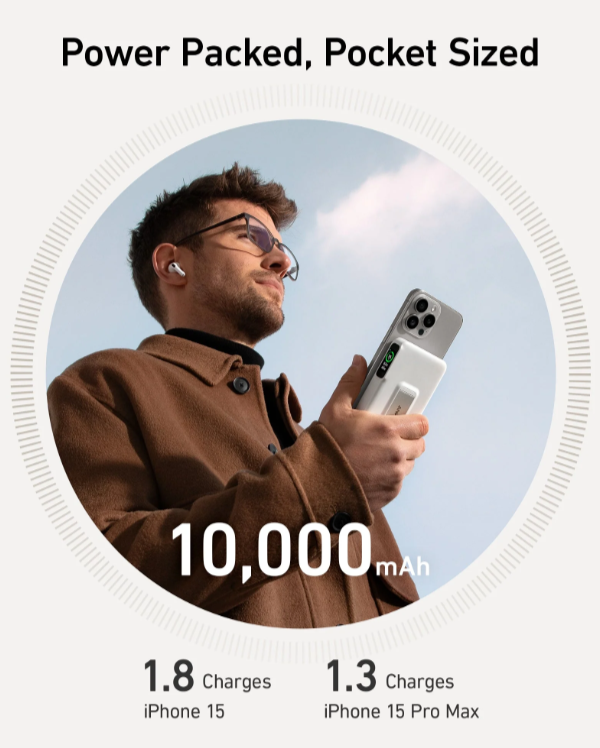 The Anker MagGo Power Bank (10,000mAh) delivers 15W wireless charging for fast, safe, and efficient power. Able to charge an iPhone 15 to 50% in just 44 minutes. It features a 10,000mAh capacity for about 1.8 full charges and includes a smart display showing battery status and recharge time. A built-in stand allows hands-free viewing.